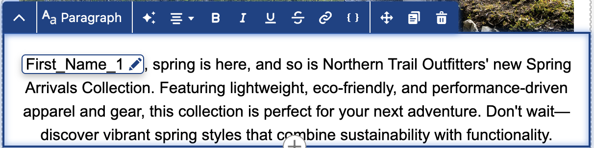 - Edit the copy by adding a comma after the merge field and changing the first word to lowercase.