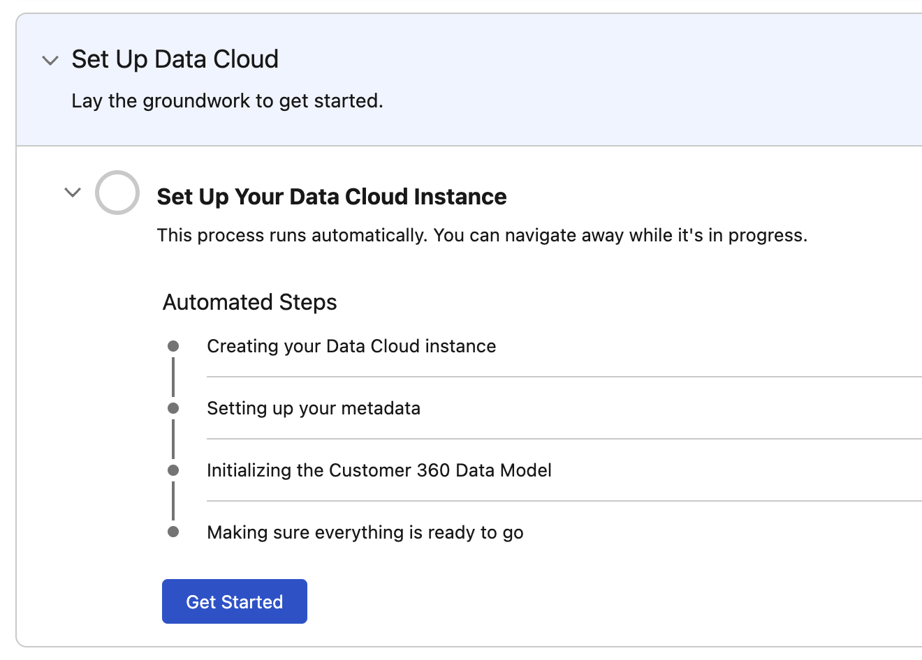 - Click Get Started from the Data Cloud Setup Home page.