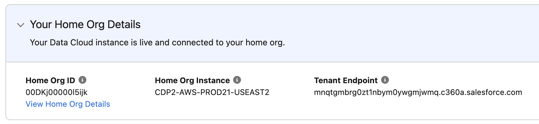 - Once the setup process is complete, your Home Org details will appear on the Data Cloud Setup Home page.
